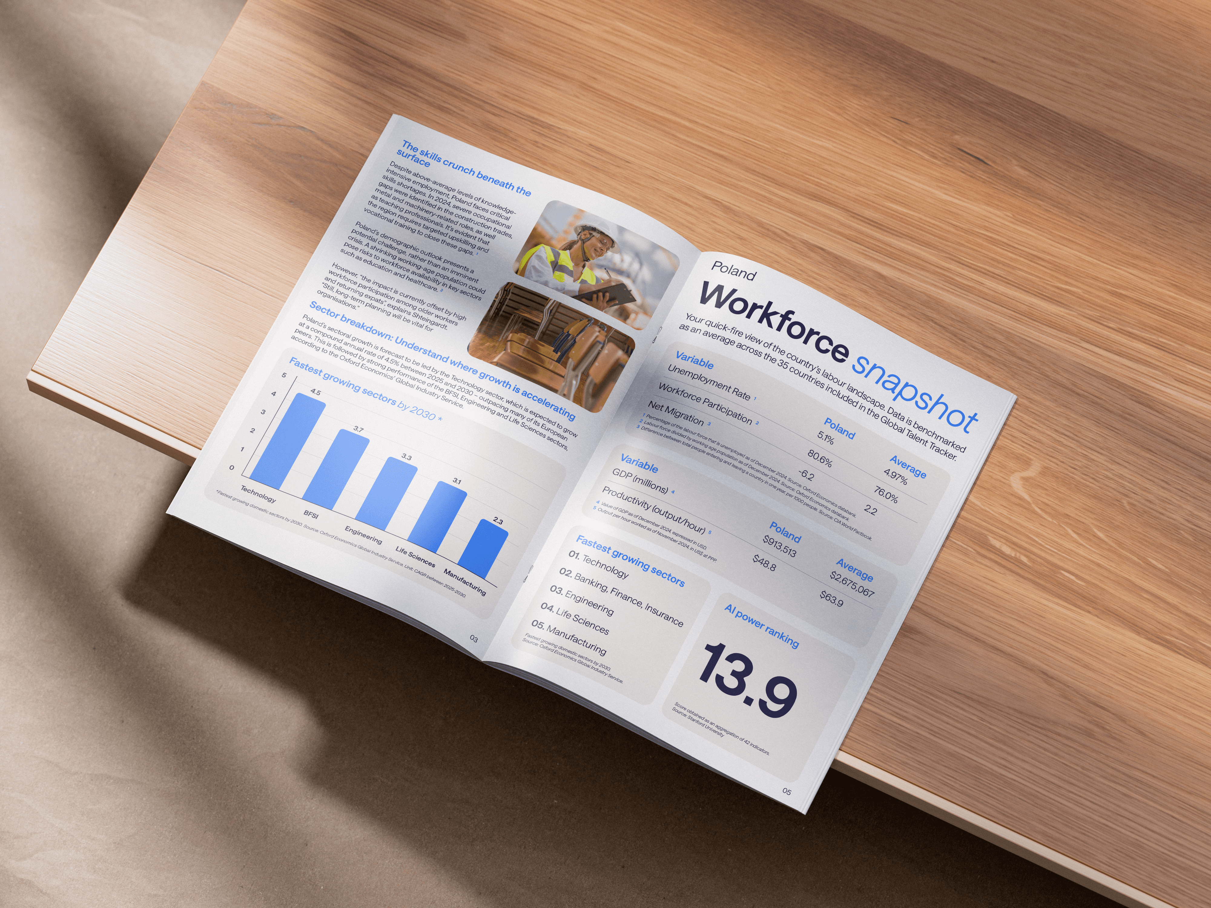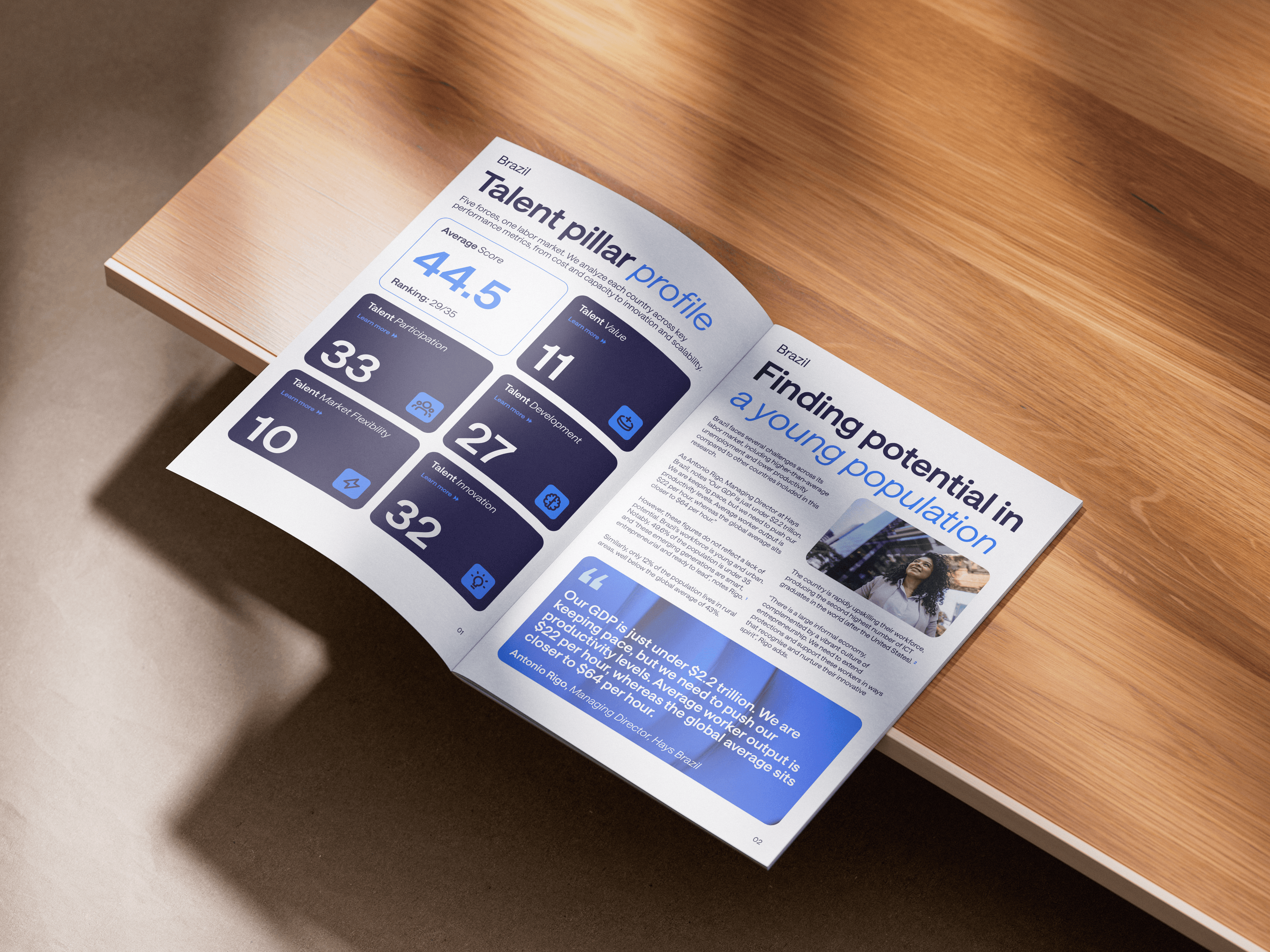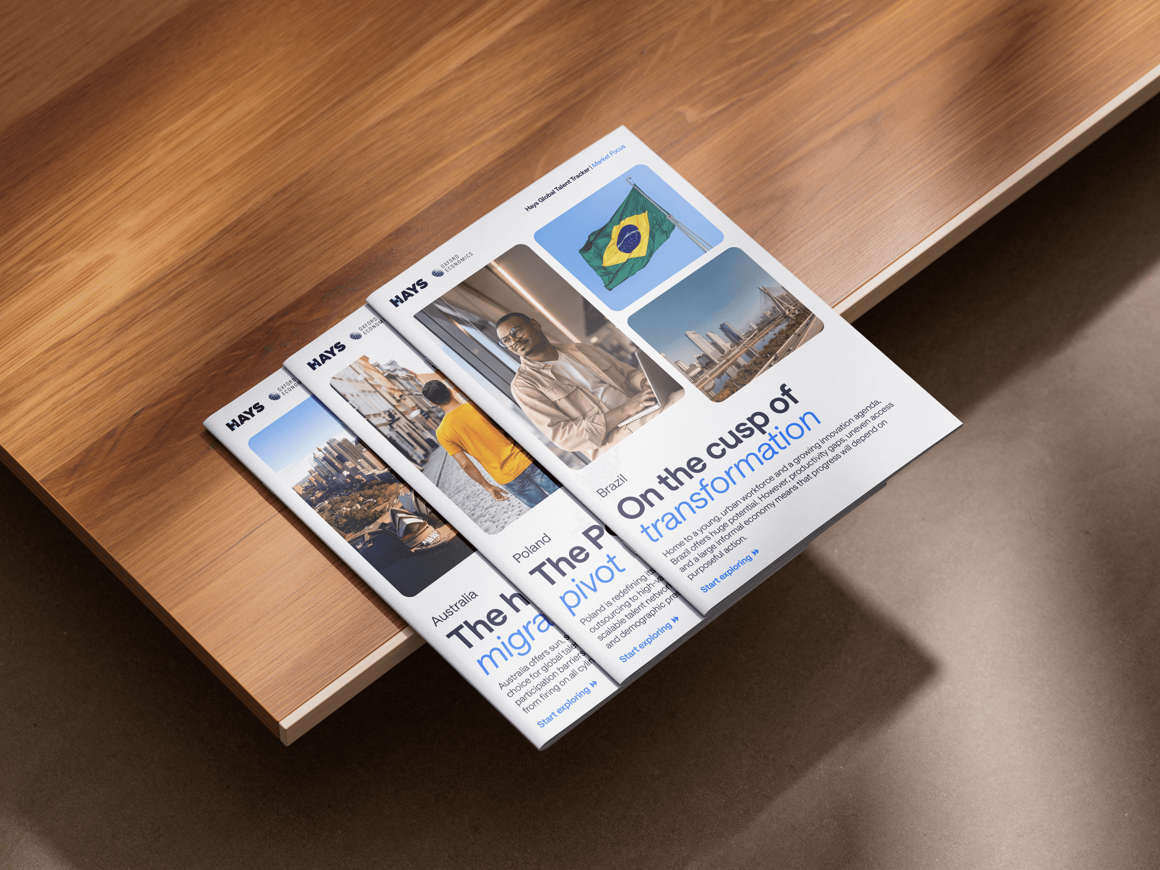 Built as companions to the Hays Global Talent Tracker, these workforce snapshots were created to make complex labour data feel understandable at a glance. By translating dense metrics into simple visuals across 12 countries, the project turns a traditionally static report into something people can quickly read, compare, and act on. This project included the creation of 12 separate country snapshots, each designed using a modular grid system to information and images could be changed easily, while keeping visual consistency.