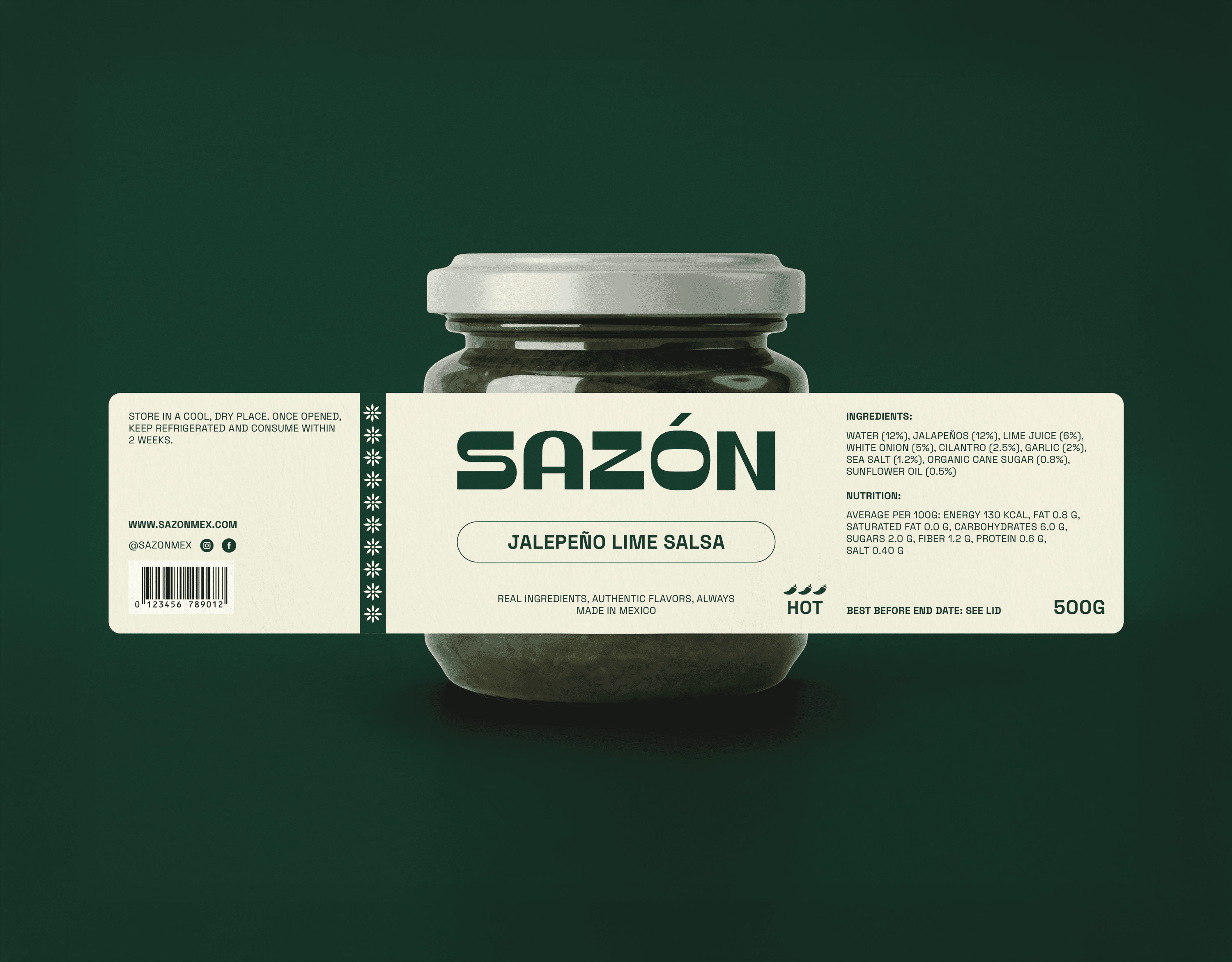 Sazón began as a response to the visual noise commonly seen in the salsa aisle. A category full of bold flavours but packaged in the same clichés like flames, mascots, and crowded labels that make choosing harder than it should be. I wanted to imagine something quieter, clearer, and more confident. This concept explores a modern, flavour-first identity built on bold colour, simple hierarchy, and an intuitive heat scale. No gimmicks, no clutter, just a system that lets each salsa speak for itself. The result is a calm, contemporary brand that stands out by not shouting and brings clarity and character to a familiar product.